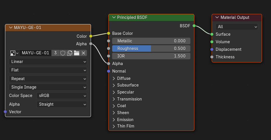 - そのテクスチャノードのAlpha出力をShader Editor内のノPrincipled BSDFノードのAlpha入力に接続します。